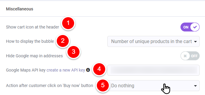 These settings allow additional control over your store. Through them, you can hide the cart, add a dynamic map from Google Maps, as well as direct the customer to the desired page.